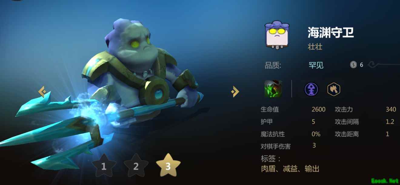 外号大鱼人。 身材评估血量中上,攻击力很高,攻速较快。综合来说很强。 技能评估非常强的DEBUFF。1级减甲15,直接给你搞成负数增加己方物理输出。但跟直接作用的技能比效果不行,后期3级效果强力,骑士开盾也顶不住,综合来说物理阵容收益还可以。 羁绊评估战士和海族。战士前期3战,后期6战都要用到的卡,过渡很平滑。海族的话要等到人口拉起来配合海妖使用。 拿卡评估拿棋优先度3星,前期不仅可以用于凑3战士加强阵容肉度,本身优秀的身板使其成为优秀的打工仔之一,输出肉度俩不误。后期精英战阵容标配之一,可以追3。 以上是小编整理的《多多自走棋》海渊守卫拿棋解析,不知道大家还喜欢吗?记得点击收藏手游网,更多精彩内容实时更新。 |