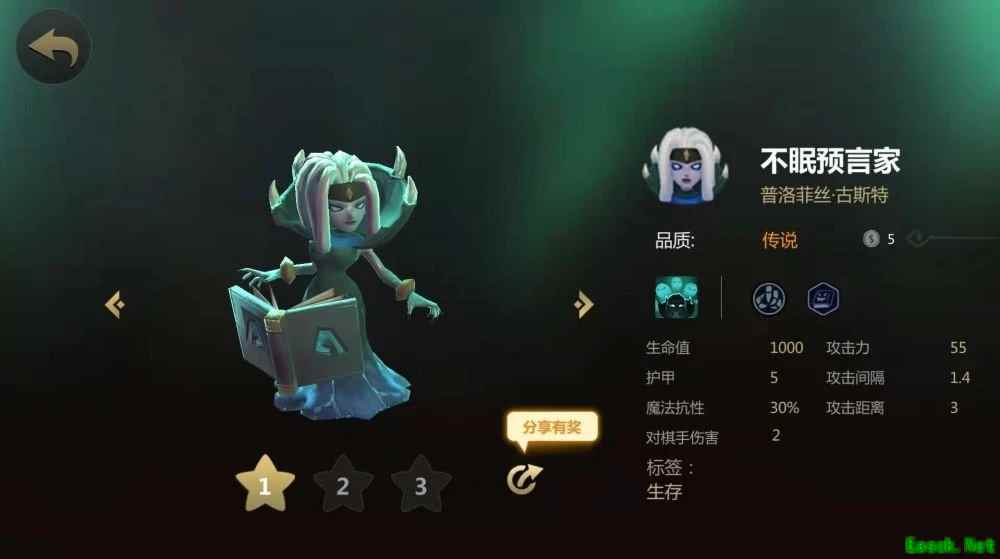 不眠预言家 5费,不眠/术士 技能:破坏球(在10秒内每0.4秒召唤1个对1名敌人造成150物理伤害的法球,在技能结束时回复法球造成伤害总量25%的生命值。CD20秒) 不眠预言家一般是出现在不眠猎的阵容里,她的技能非常强力,在2术士的羁绊下,技能可以疯狂给自己回血,就算残血了技能结束后还能再次回一波老血,2星之后可以直接当前排使用。