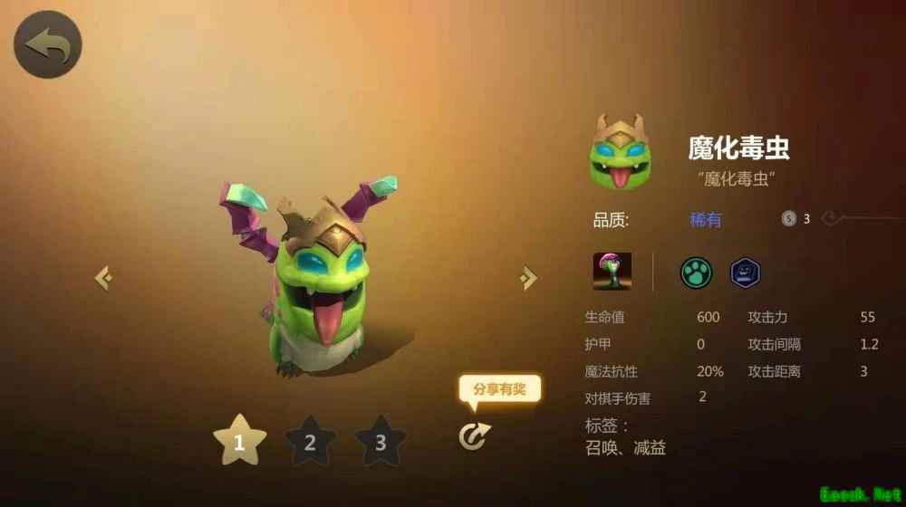 魔化毒虫 3费,野兽/术士 技能:毒虫守卫(召唤1个免疫魔法伤害且攻击使敌方棋子在5秒内攻速降低40%的毒虫守卫。CD5秒) 魔化毒虫作为野兽种族的一员,经常会出现在野兽战的阵容里。技能召唤出来的毒虫普攻可以让敌方棋子降低大量攻速,也是一个不错的软控,而且技能CD短,给他一些回蓝装经常可以叫出3条虫以上,可以给对手很大的压力,入血能力极强。