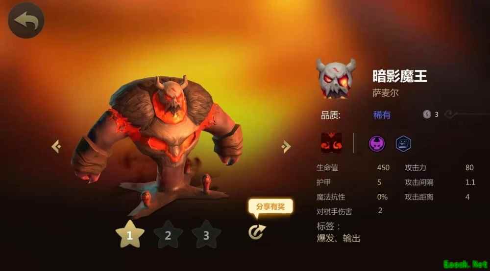 暗影魔王 3费,恶魔/术士 技能:影之歌(向四周释放8道冲击波对敌方棋子造成150魔法伤害。CD15秒) 暗影魔王是恶魔族里唯一一个术士,技能可以打出大量的AOE伤害,作为一名高贵的恶魔,普攻输出也很高,所以经常会被拿来当输出用。暗影魔王除了恶魔的阵容以外也经常会出现在法师的阵容里,技能的魔法伤害配上法师的羁绊能打出更高的输出。