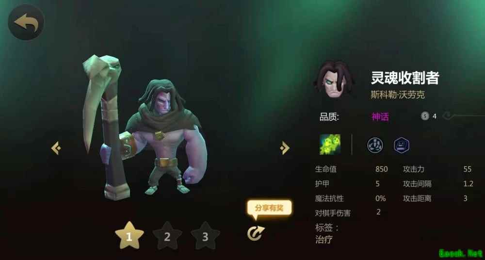 灵魂收割者 4费,不眠/术士 技能:竭心脉冲(对3格范围内的敌方棋子造成100魔法伤害,并为范围内友方棋子恢复100生命。CD5秒) 灵魂收割者作为不眠族的一员,一般是出现在骑士阵容或者猎人阵容中,可以凑出不眠族的羁绊削弱敌方的防御力,技能是群体的AOE并且可以治疗友军,技能CD短,给他回蓝装能大大的提高己方棋子的存活,这让他在神法的阵容中也有不错的表现。