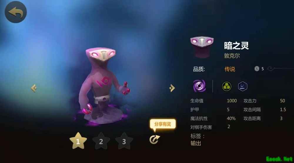 暗之灵 5费,灵族/术士 技能:黑洞(对3格范围内敌方棋子造成每秒4%最大生命值的纯粹伤害,持续10秒。CD20秒) 暗之灵是非常抢手的一个棋子,技能打的纯粹伤害,可以很好的克制各自骑士和洞洞族这种大肉的阵容,可以说是一个术士万金油,不管在什么阵容里都可以有他的一席之地。