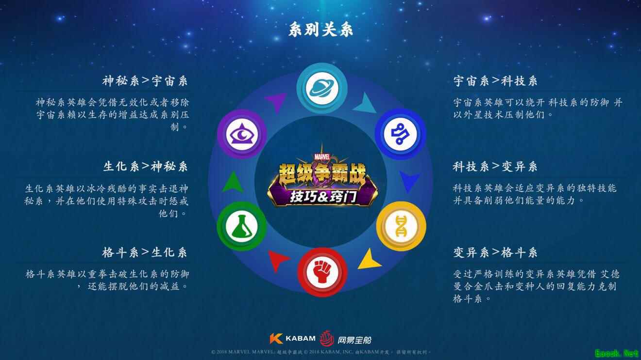 其实克制关系很容易理解,科技系英雄很难适应宇宙系的外星科技,但对于消除变异系英雄的变异能量却是一把好手。而格斗系英雄却对变异英雄的再生能力束手无策,生化系科学正在捣鼓实验时就被格斗系先发制人。低防御的神秘系英雄难以承受生化系生化炸弹的一击之威,但对于神秘不着边际的宇宙系英雄,神秘系英雄却能轻松让他们的增益无效化。在游戏中玩家能很清楚的通过图标区分这六个系别:拳头——格斗系、星球——宇宙系、药瓶——生化系、DNA——变异系、金字塔——神秘系、线路——宇宙系。