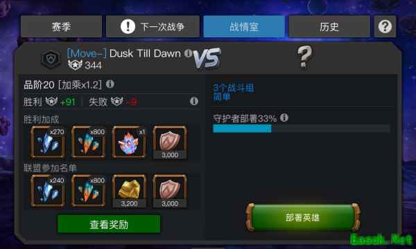 而且赛季结束之后会在联盟中显示上个赛季的段位,赛季奖励也会根据联盟段位在赛季结束之后统一发放。 联盟战争的奖励可以让我们在前期快速拿到很多英雄水晶碎片,如果联盟的品级不断升高,还能拿到很多高阶的奖励,是联盟非常重要的活动。 |