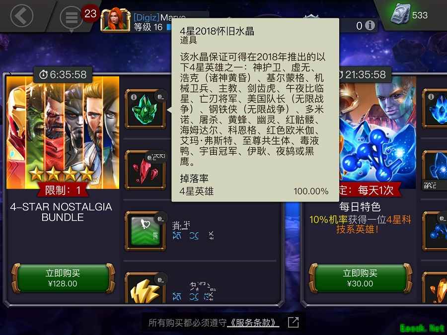 对于新手玩家来说四星英雄是前期绝对的中流砥柱,有了四星英雄在新手难度的副本基本就可以横行霸道,然后依靠奖励再去获得高级英雄水晶,获得更多的四星英雄……这是游戏中比较良性的一个循环。高级英雄水晶获得的渠道非常多,新手玩家如果抽不到四星英雄在前期也不用太伤心什么的,四星英雄是迟早可以是开到的。 以上就是一个《漫威:超级争霸战》新手玩家的游戏历程,希望能对游戏同好有所帮助。 |