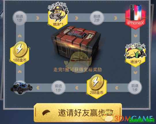 1、活动期间玩家成功登录游戏即可激活起点,获得初始前进步数,随机1-3步; 2、将活动分享到群聊/好友且有好友点击即可获得1次前进机会,每次分享只能增加1次前进机会,每次随机前进1-3步,多人点击无效,分享到不同的群可急速开启宝箱; 3、汽车完整走完第1圈可解锁初级宝箱,走完第2圈可解锁超级宝箱,开启宝箱有机会获得金币,趣味喷涂,珍稀服装、实物等大奖,每位玩家最多可获得2次宝箱奖励; 以上就是小编整理的和平精英勇者前行宝箱礼包介绍,想知道更多相关资讯攻略的请关注手游网。 |