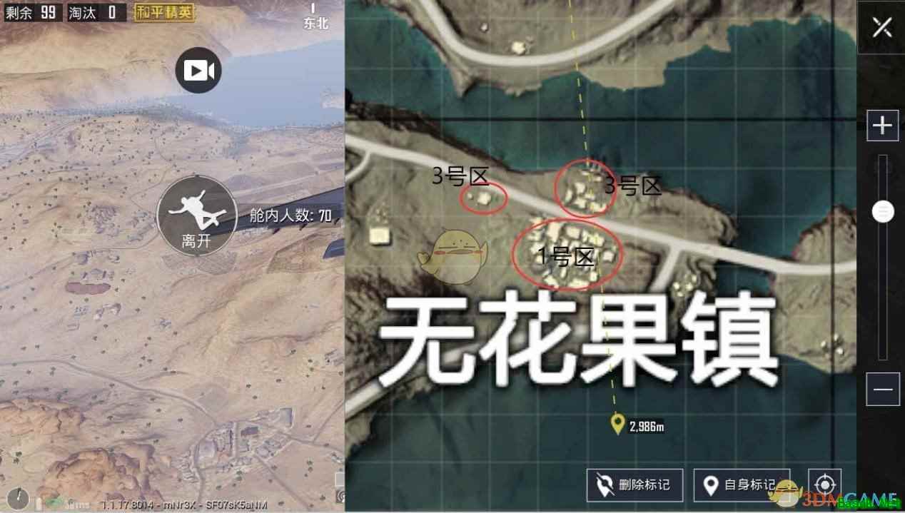 小编将无花果镇主要分为3个区域,1号是最大的资源区,2号其次但紧挨着码头可以快速搭乘快艇,3号区偏僻但却是一处卡位点。其他附近的都是小野区。 主要的战斗以及资源搜集还是在1号区与2号区。若飞机航线的起始点恰巧从此经过,选择跳伞至此也是不错的选择;但考虑到资源量方面推荐1人或2人组队即可。 【推荐落地点】