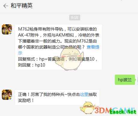 和平精英8月14日每日一题 题目:M762枪身带有附件导轨,可以安装标准的AK-47附件,外观与AKM相似,冷艳的外表下潜藏着非一般的威力。现实的M762是由哪个国家的武器制造公司出品的呢? 答案:hp波兰 和平精英每日一题参与方式: 1、关注和平精英微信公众号 2、点击右下角【赛季福利】-【绑定有礼】绑定自己的游戏账号 3、绑定成功后,点击【赛季福利】-【每日一题】参与当日每日一题活动,答对每日一题即可参与抽奖一次,回答次数不限,所以不用怕答错哦! 以上就是手游网小编为你带来的和平精英8月14日每日一题的答案,更多和平精英游戏攻略,请关注手游网和平精英专区,小编将持续为你更新。 |