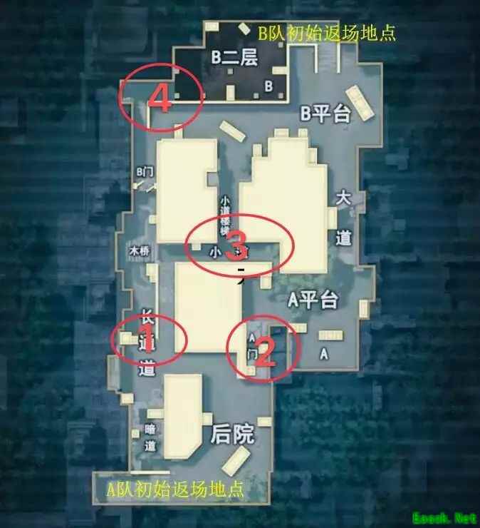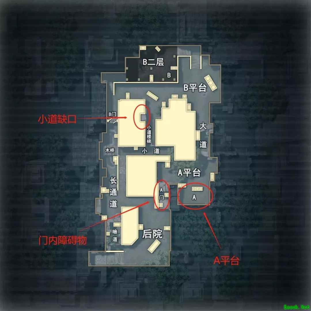 注意:门内的障碍物、门外上到小道的缺口、A平台下边的A位置,这些是特种兵们喜欢蹲人的位置,要留意是否有人在潜伏。