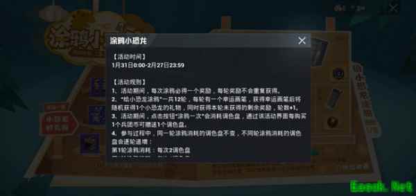 涂鸦小恐龙获取概率同一轮涂鸦消耗的调色盘不变,不同轮涂鸦消耗的调色盘会逐轮递增: 第1轮涂鸦消耗:每次2调色盘 第1轮涂鸦消耗:每次2调色盘 第2轮涂鸦消耗:每次4调色盘 第3-4轮涂鸦消耗:每次8调色盘 第5-6轮涂鸦消耗:每次12调色盘 第7-8轮涂鸦消耗:每次16调色盘 第9-12轮涂鸦消耗:每次20调色盘 每轮涂鸦获取概率 幸运画笔:4.5% 物品奖励(每个):19.1%