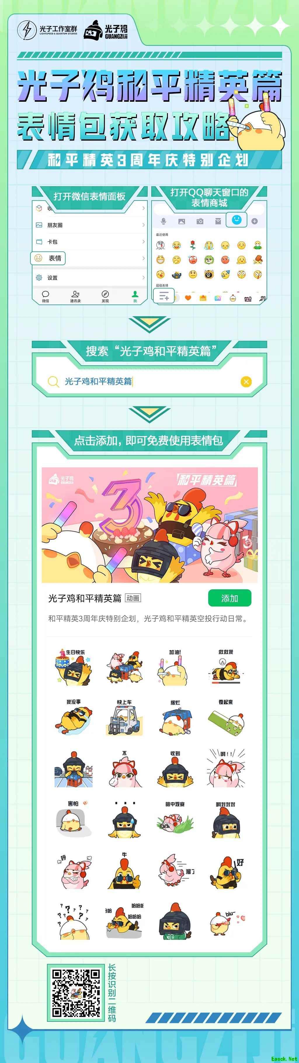 《和平精英》光子鸡表情包获取方法介绍《和平精英》3周年版本“空投行动”已开启!光子鸡盔仔与他的小伙伴们呆呆、鸡哥和啾啾,与大家一起庆祝和平精英3周年庆! 他们是光子战术竞技推荐官,是我们每个特种兵的竞技小伙伴,他们暖心营业,为每个玩家加油打call !!这次他们又给大家带来了全新的表情包~ 嗨!表情包现已在微信和QQ平台开放免费下载,给大家准备的获取攻略请收好!(*╹▽╹*)