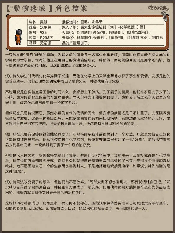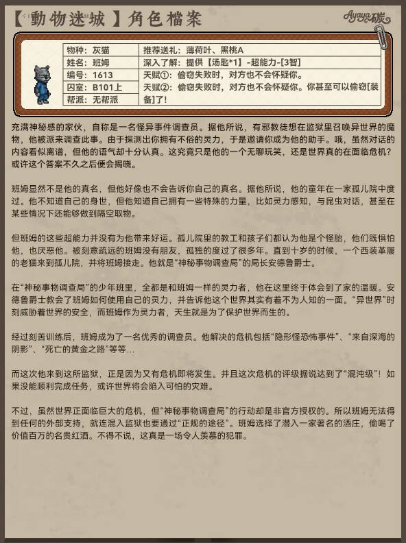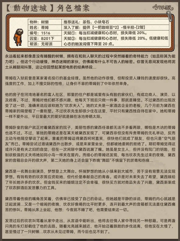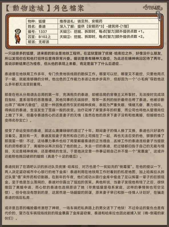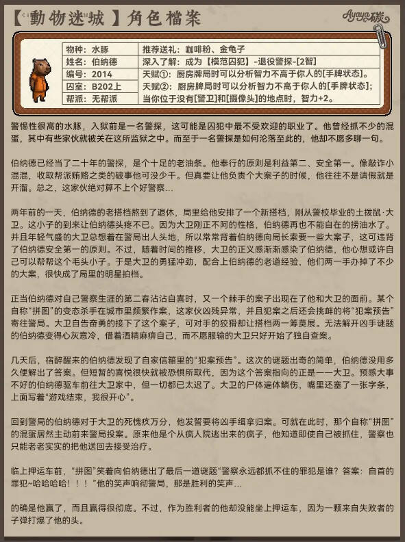 在游戏《动物迷城》中,B区无帮派成员的角色档案分享,有助于玩家更全面地了解这个区域的角色构成,包括他们的背景故事、性格特点、技能和人际关系等。这样的信息可以帮助玩家更好地融入游戏世界,理解角色的行为,并制定相应的游戏策略。 对于无帮派角色的档案分享,玩家可以更深入地了解这些角色的背景和故事,从而在游戏过程中更好地与他们互动,甚至可能影响游戏进程或者结局。这些角色可能会在任务中提供帮助或者阻碍,他们的选择和行为将受到玩家行为的影响。 总的来说,动物迷城B区无帮派成员档案分享对玩家有积极的影响,有助于增加游戏的趣味性和深度。玩家可以根据角色的特点来制定自己的游戏策略,从而更好地享受游戏世界。 动物迷城中B区无帮派的每一位成员在游戏中都有丰富的细节以及人物的过往,同时这些人物各个都是有着十分精彩的人物经历,通过这些人物的背景故事能够更好的体验到游戏的剧情,下面就为大家分享动物迷城中B区无帮派的全成员档案一览。 以下内容由小黑盒用户Ayaya碳分享。 继之前的【尖牙帮】和【A区无帮派NPC】后,今天给大家盘点的是《动物迷城》B区(玩家扣押外的那边)没有帮派的NPC背景故事! 同样也能看到不少致敬的影子,故事也都是非常丰富的!值得一看~ |
