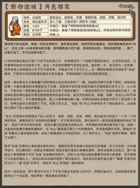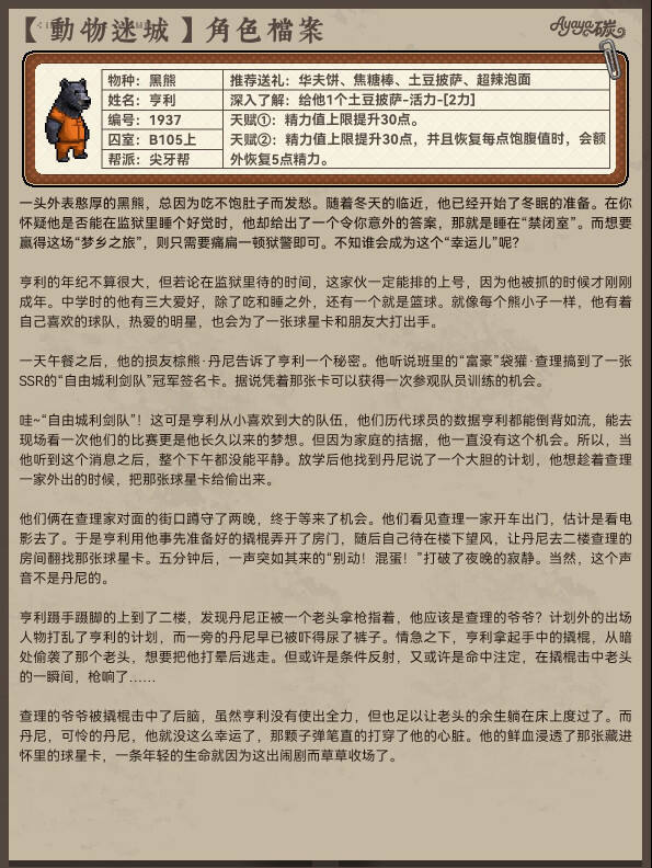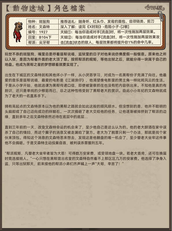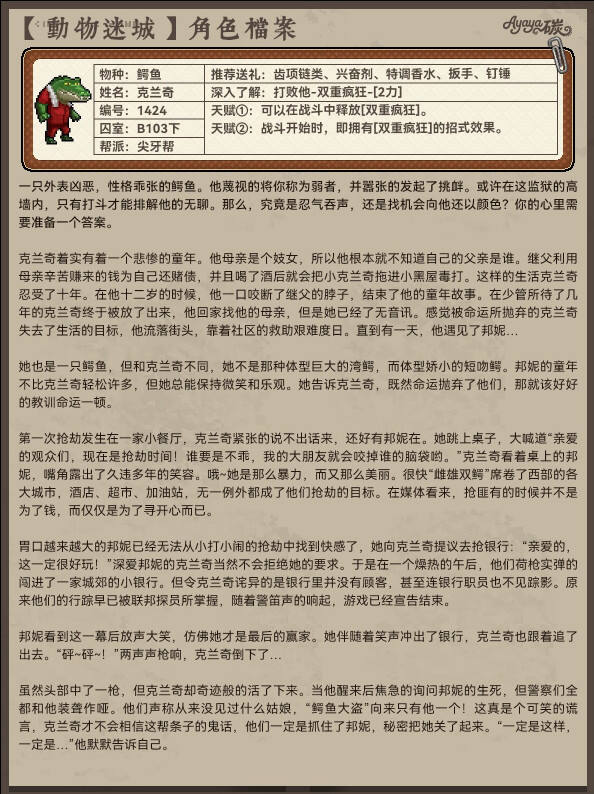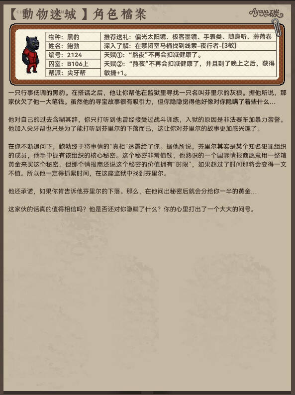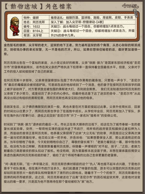 动物迷城尖牙帮角色档案分享对玩家的影响主要体现在以下几个方面: 1. 角色认知和代入:玩家可以通过了解每个角色的背景故事、性格特点、技能特长等,更好地理解和代入角色,体验游戏剧情和任务。 2. 游戏体验:角色档案分享有助于增加游戏的趣味性和互动性,使玩家更愿意投入到游戏中,增加游戏的可玩性和吸引力。 3. 角色塑造和故事发展:通过角色档案分享,游戏开发者可以更好地塑造角色形象,丰富游戏世界,推动故事情节的发展。 4. 社交互动:角色档案分享也能促进玩家之间的社交互动,增加游戏的社交元素,使玩家在游戏中能够更好地交流和互动。 5. 角色平衡和调整:在玩家反馈和讨论中,角色档案分享有助于游戏开发者更好地了解玩家的需求和反馈,从而对游戏进行平衡和调整,提高游戏的公平性和可玩性。 总的来说,动物迷城尖牙帮角色档案分享对玩家具有积极的影响,有助于增加游戏的趣味性和互动性,丰富游戏世界和故事情节,同时也能够促进玩家之间的社交互动和反馈。 动物迷城中尖牙帮的每一位成员在游戏中都有丰富的细节以及人物的过往,通过这些人物的背景故事能够更好的体验到游戏的剧情,下面就为大家分享动物迷城中尖牙帮的全成员档案一览。 以下内容由小黑盒用户Ayaya碳分享。 《动物迷城》尖牙帮档案!每个角色背后都有自己的故事! 尖牙帮并非刻板的“全员恶人”(除了某头猪哈),他们每个人也都有各自的过往......在游戏中还有更多丰富的细节~这里就不过多展开了啦。(他们的一些行为和故事设定是高度一致的,比如狮子得知老虎的故事后的表态,很佩服制作者的写作能力) 尖牙帮成员: 雄狮 阿历克斯 北极熊 弗拉基米尔 鳄鱼 克兰奇 黑熊 亨利 黑豹 鲍勃 斑鬣狗 文森特 疣猪 哈库拉 |