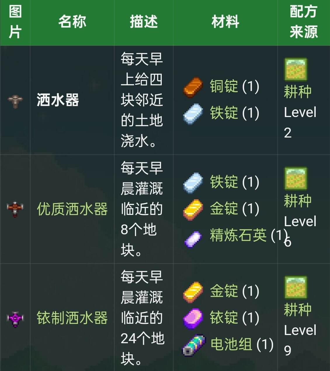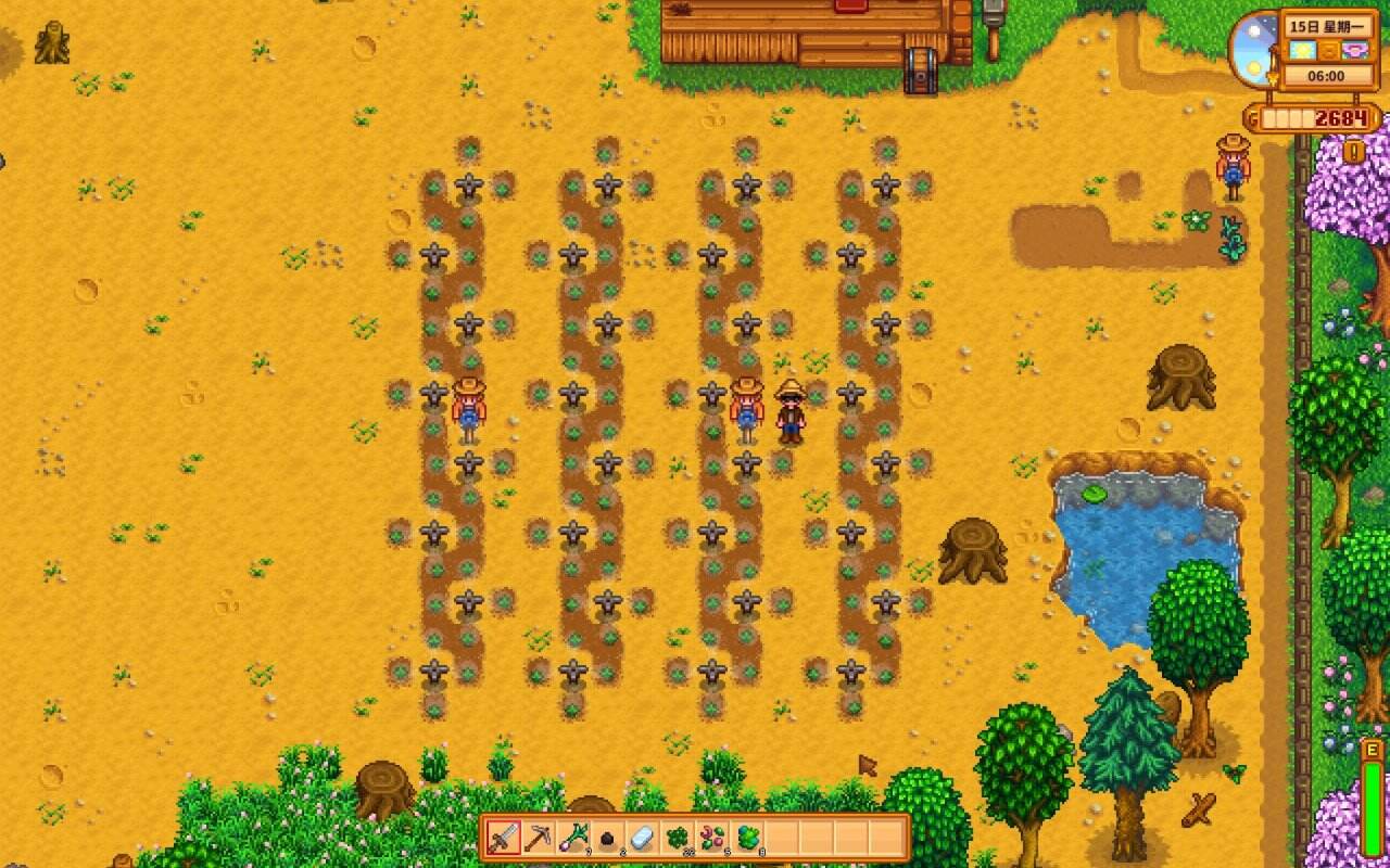 "我们讨论星露谷物语种地技巧分享 星露谷物语种地需知一览"对玩家的积极影响主要体现在以下几个方面: 1. 提高游戏体验:玩家通过学习并应用这些技巧,可以更有效地管理他们的农场,包括更合理地种植作物、更有效地利用资源等。这不仅可以减少玩家在游戏中的摸索时间,提高游戏体验,还可以使玩家有更多的时间和精力去探索和享受整个游戏世界。 2. 增加收入:通过更有效的种植方式,玩家可能会有更高的作物收成,从而增加他们的金币和道具收入。 3. 策略多样性:玩家可以选择不同的种子、土壤和工具,以及在合适的时间进行播种,这些选择可以产生不同的效果,增加游戏的策略深度。 另一方面,“星露谷物语种地需知一览”可能会给玩家带来一些挑战,因为玩家需要了解并适应游戏中的各种限制和规则。例如,玩家需要了解每种作物对土壤、天气和时间的需求,以及如何处理游戏中的疾病和害虫。这些知识可以帮助玩家更好地适应游戏环境,提高他们的生产效率。同时,这也可能会让一些新手玩家感到困惑或困扰,因为他们可能需要花费更多的时间去理解和适应这些规则。 总的来说,“种地技巧分享”和“种地需知一览”都会给玩家带来积极和消极的影响,具体的影响取决于玩家的个人能力和游戏目标。 星露谷物语中种地是游戏的核心玩法之一,通过将种植的作物进行出售或者进行酿酒都可以获得大量收益,很多玩家在游玩的过程中不知道应该高效的种地方法,下面就为大家分享星露谷物语中种地的小技巧。 以下内容由小黑盒用户Krein5376分享。 星露谷里最赚钱的方法就是种地,种出值钱的作物拿去加工酿酒可以获得大量收益。拿啤酒花举例,如果你能在夏季第一天种植两百株啤酒花种子,那你将收获3400个作物。把这些啤酒花拿去小桶酿成淡啤酒,一杯啤酒价值420,总价值就超过140万。有了这些钱你将舒适的渡过第一年,轻松的开启第二年,为美好的星露谷生活打下坚实基础。 现在为了种植两百株啤酒花为目标开始讲解: 星露谷的种地必须每天都要浇水,数量少可以坚持,但多了就是费时费力。如何才能一劳永逸的解决浇水问题,这个时候就迎来了星露谷最强的至高神器——洒水器 洒水器可以全自动的给作物浇水完全解放劳动力,虽然每一个浇水范围有限,但只要按照洒水器的规模去种就只需要等待收获,省下大量体力与时间去做更重要的事。 我们的目标就是第一个名字就叫洒水器的洒水器,俗称初级洒水器。虽然很多人会嫌弃初级洒水器只能浇上下左右四格,不如优质洒水器的八格整齐规律,但初级洒水器绝对是最好用的。 洒水器的配方解锁需要耕种经验,在这之前只能靠手动浇水来提升耕种等级。初级洒水器配方的耕种二级需要380点耕种经验,而优质洒水器的六级需要3300点。单单这一项就增加了八倍以上的获取难度。 然后是材料,初级洒水器需要的铜铁可以在矿洞20层与40层稳定获取。优质洒水器消耗的金锭需要下矿到80层,矿洞是越深越难的,所以这一步难度又翻了一倍以上。其次是石英,这个东西不能在矿洞稳定获取只能等他随机出现在地上,想要大量石英需要等后期的宝石复制机所以直接放弃。 综上所述,优质洒水器就是垃圾,初级洒水器才是神。在敲定使用初级洒水器后现在讲讲如何获得: 刚进游戏的第一天清理出一小片空地把送的15个防风草种下去,然后每天浇水等第四天收获后就可以升到耕种一级。然后去买16个甘蓝种子种下去每天浇水,甘蓝给的经验多,收获了就直接到耕种二级解锁洒水器配方。期间注意造一个稻草人放上去,如果甘蓝被吃了会导致少收获一次作物无法获得足够经验。(除此以外就不要用水壶种地了,浇水太累了尽量避免手动浇水) 有了配方就需要材料,春五日在矿洞湖北边阻挡矿洞的岩石被清理干净,地图解锁矿洞。我们的首要目标就是下矿到40层,现在简单讲讲下矿方法 在设置里把缩放调到最小的75,这样可以获得更大的视野看到更远的地方。 下矿优先把矿洞转一圈看看有没有现成的梯子,如果没有就把怪打完,所有怪死亡后有概率爆出梯子,如果还是没有再一个个敲石头靠运气把梯子敲出来。 这个运气不光是玩家的运气还有角色运气,每天起床看电视里的占卜节目,里面会告诉你当天运气如何,运气太差了最好不要下矿而是去钓鱼或砍树。 每下五层会解锁一个电梯,这样下次就不需要一层一层爬,而是直接跳转到指定楼层。我们的最终目标是40层,进去以后挖掉地图上的铁矿然后直接梯子离开,再用电梯下来刷新地图,这样又会出现铁矿就可以一直挖。铜矿同理,反复进出20或30层都可以刷。中间不要挖太多石头打太多怪,浪费时间,我们的目标仅仅是矿。 刷出来的矿石需要煤炭和炉子来烧成锭,在玩家获取第一个铜矿以后的第二天早上,铁匠就会自己来找你送出炉子配方。可以在游戏第一天直接找铁匠花75买一个铜矿,这样第二天就给你配方了,等你正经下矿以后就可以随时造炉子。至于煤炭我建议直接买,或者砍树砍多了以后觅食等级升到四级解锁炭窑,这样可以买木头烧成炭,比直接买炭便宜。: 最后有了材料制作洒水器以后就可以摆在地上了,洒水器的摆放建议按这个图。 如果你在13天以前得到32个初级洒水器就可以种下126个草莓来获得大量收益。没有这么多也没关系,草莓并不是特别重要能种多少是多