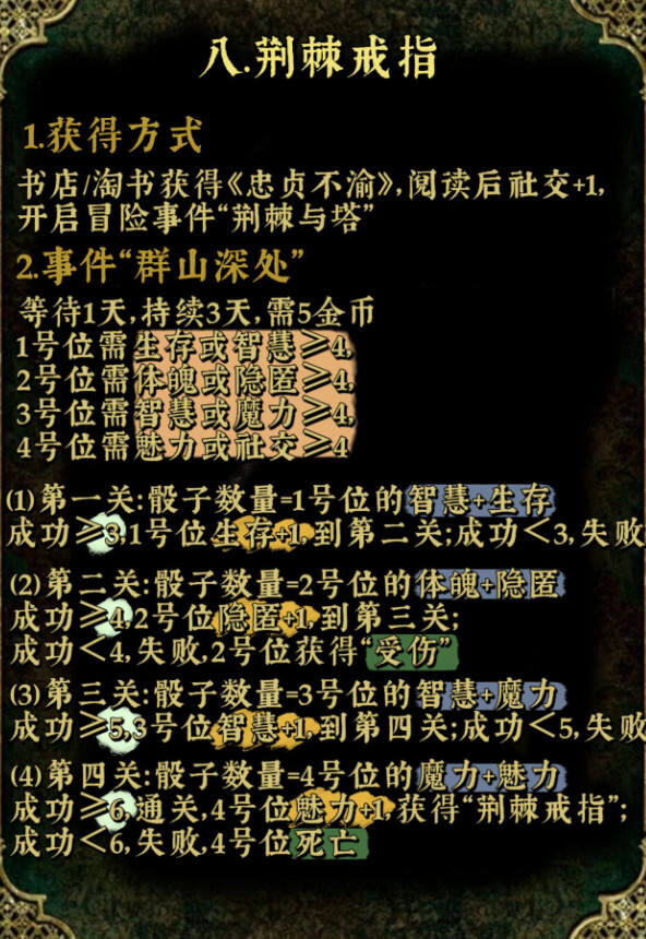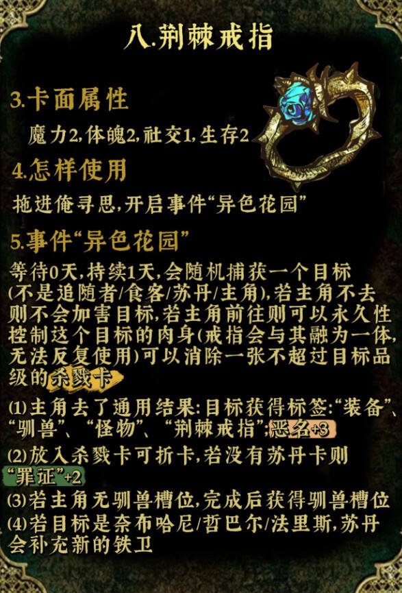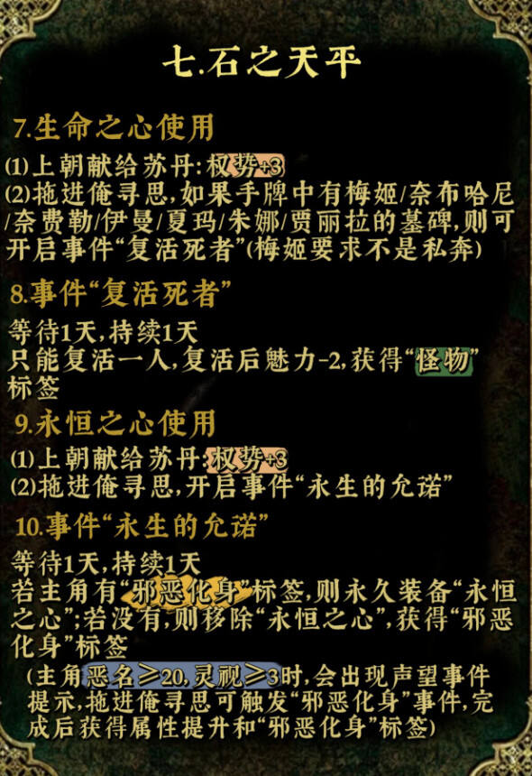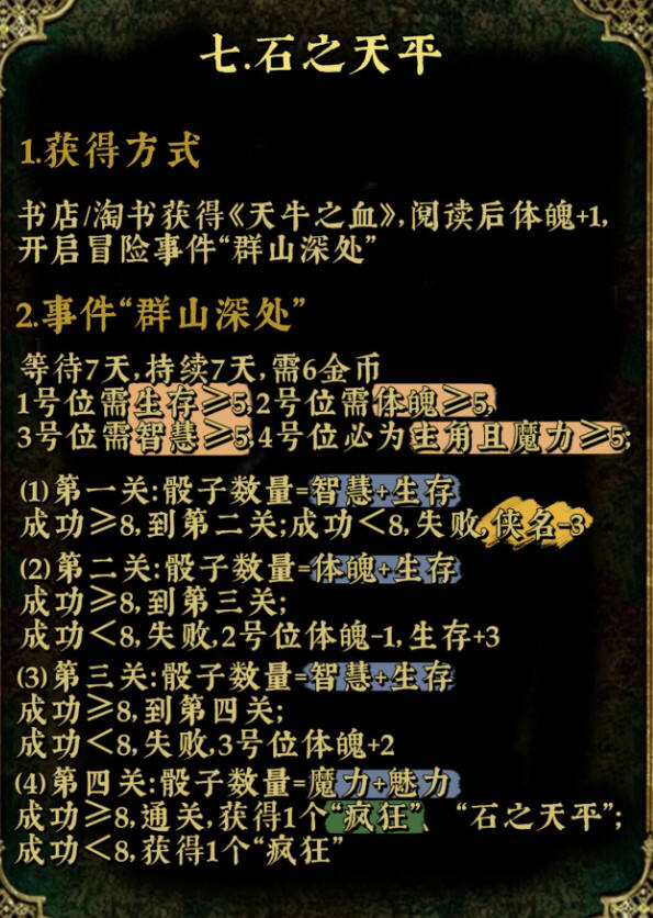 苏丹的游戏众筹道具的效果在很大程度上取决于道具的设计和用途。以下是一种可能的效果分享: 1. 提升参与感:对于许多游戏玩家来说,众筹道具可以让他们觉得自己更加参与到了游戏的开发过程中,提升了他们的参与感和归属感。 2. 增强互动:拥有与众不同的众筹道具,往往会使玩家们在游戏过程中有更多的互动和交流。例如,他们可能会比赛看谁能获得更多众筹道具,或者用道具进行一些特别的玩法。 3. 增强游戏的吸引力:如果众筹道具的设计足够吸引人,那么它可能会成为游戏的一种卖点,帮助游戏吸引更多的玩家。 4. 促进社区建设:通过众筹获得的道具,常常会成为玩家们之间交流和炫耀的话题。这有助于形成一个积极的游戏社区环境。 5. 可能的困扰:虽然众筹道具可能带来一些积极的影响,但也可能带来一些困扰。例如,如果过多的玩家获得了众筹道具,可能会稀释掉原本的稀有性,从而影响道具的价值和吸引力。 至于苏丹的游戏众筹道具有什么效果,这会因具体的游戏和道具设计而异。一般来说,道具应该设计得足够独特,能够满足玩家的期待,同时又不会过度消耗他们的热情。道具的设计也需要考虑到玩家的实际需求和游戏的整体环境。 希望这个答复符合您的要求。 苏丹的游戏中众筹道具有着不同的属性,同时可以触发对应的特殊事件,很多玩家不知道众筹道具应该如何触发对应的特殊游戏事件,下面就为大家分享苏丹的游戏众筹道具石之天平、荆棘戒指、驯服马衔、以及超级贝姬夫人的详细效果。 以下内容由小黑盒用户滟朦分享。 十神器最后一弹石之天平,荆棘戒指,驯服马衔,和超级猫猫! 注:“群山深处”虽然对每个位置的属性有要求但判定时应该是所有人的对应属性加一起提供骰子 主页/合集内有其他众筹道具攻略,还有屠龙线流程、随机事件、宰相事务、星象等等攻略 碎碎念:戒指和马衔的文本都很好品啊(擦嘴)之后大概会先整屠龙线的文本再来整理这些道具的文本 有些事件流程较长所以文字比较多,已经尽力去突出重点了(晕 |