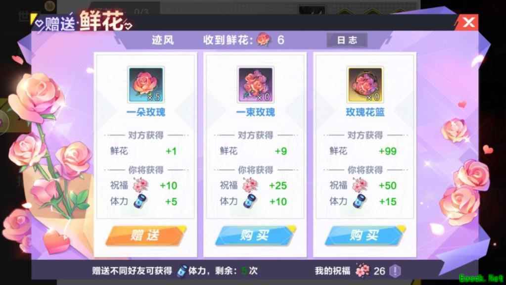 在封印战记这个游戏中,在添加好友的界面中,可以找到送花这个选项。这个送花是可以提升玩家和别的玩家之间的亲密值的。同时,这个送花系统,是可以相互送的,不过送的话,也要找会还的那种,毕竟有鲜花榜这个东西,靠前的名次,系统会给予奖励的。 在好友系统中的鲜花,给不同的指挥官首次送花时,会扣减一次送花奖励次数,并可额外获得体力、祝福值奖励。并且根据花的级别不同,所获得的体力和祝福值也是不同的。 送花奖励次数用完后,或者对同一个角色重复送花时,仅能获得祝福奖励。并且指挥官可通过送花日志确认赠送的相关信息。