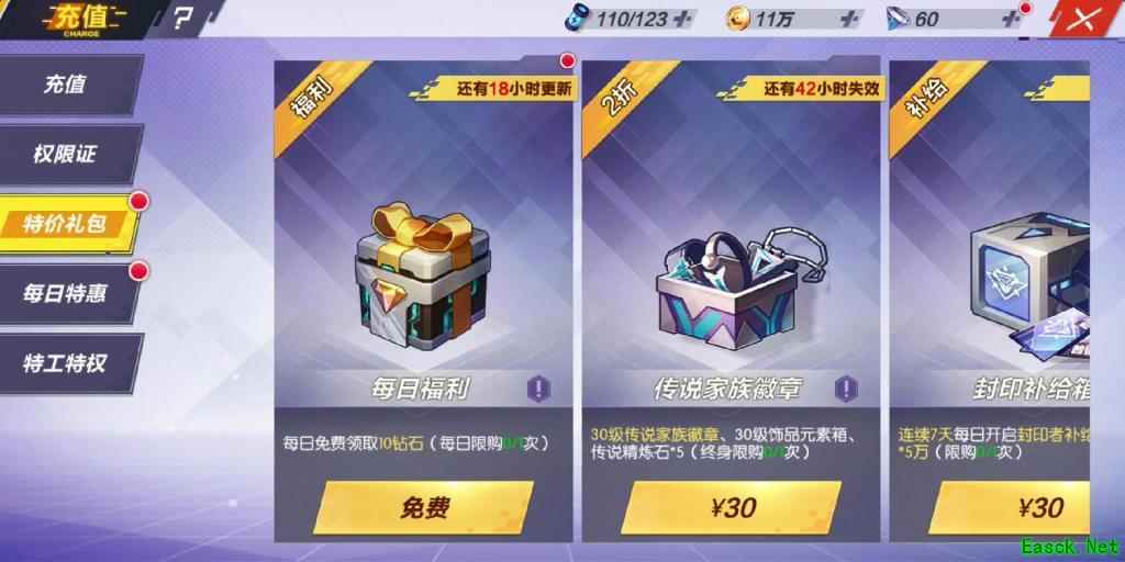 每日特惠 玩家可以在商城的特价礼包里领取每日福利,虽然钻石不多,但是免费领取还是非常不错的。