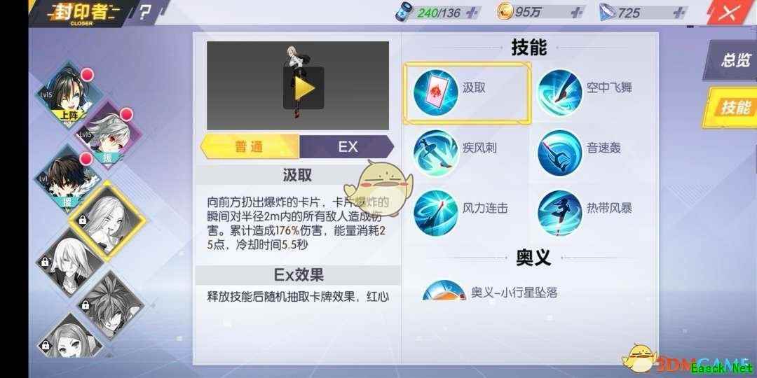 评级:A 属性介绍(1级) 攻击:110 防御:28 生命:680 技能1.汲取:向前方扔出爆炸的卡片,卡片爆炸的瞬间对半径2m内的所有敌人造成伤害。累计造成175%伤害,能量消耗25点,冷却时间5.5秒。