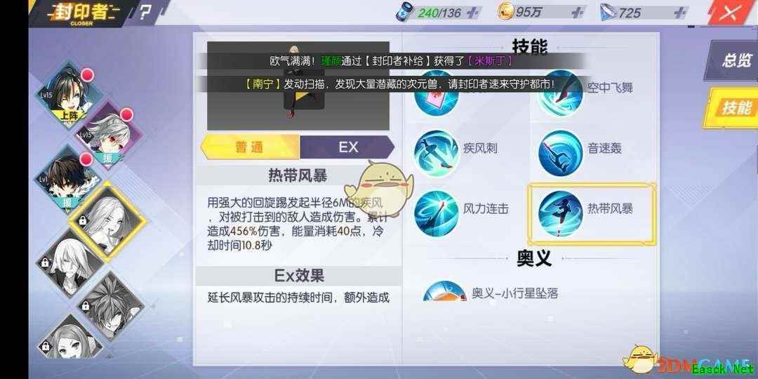 6.热带风暴:用强大的回旋踢发起半径6m的疾风,对被打击到的敌人造成伤害。累计造成455%伤害,能量消耗40点,冷却时间10.8秒。