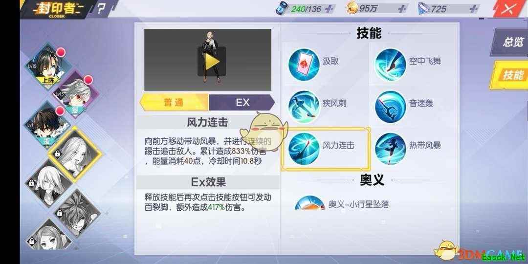 5.风力连击:向前方移动带动风暴,并连续的踢击追击敌人。累计造成833%伤害,能量消耗40点,冷却时间10.8秒。