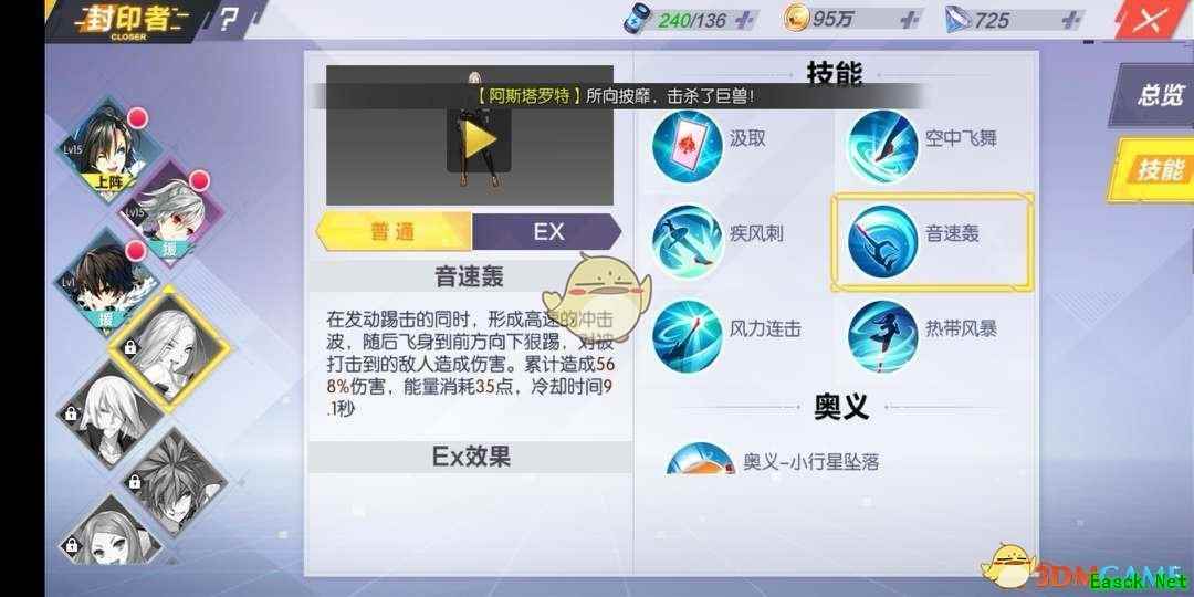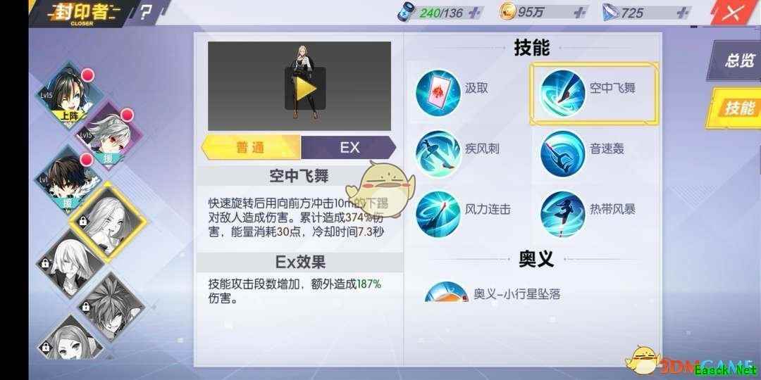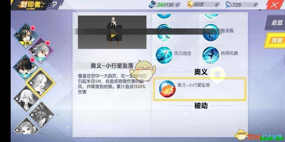 奥义技能 奥义-小行星坠落:垂直往半空中一大跳后,在一定时间后引起半径5m,会造成物理伤害的旋风,并降落到地面。累计造成1520%伤害。