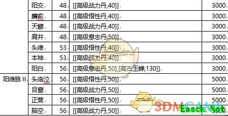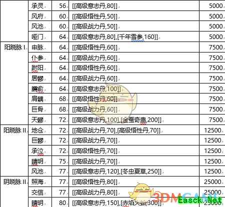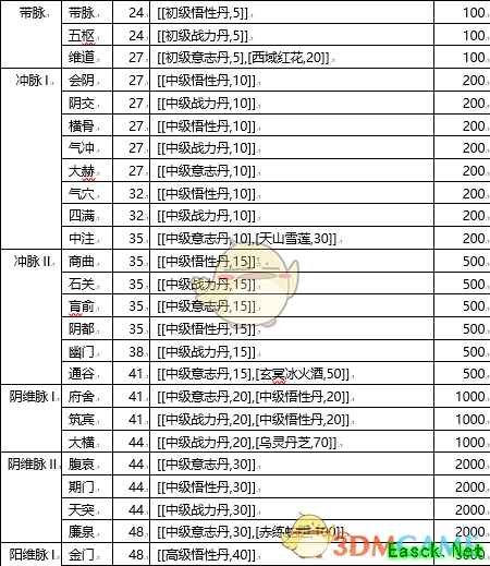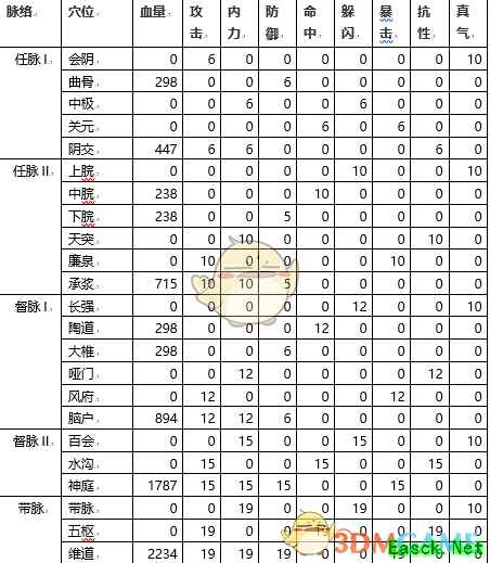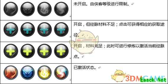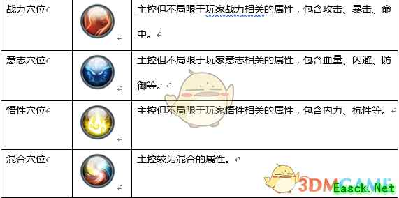侠客的经脉穴位分为四类:战力穴位、意志穴位、悟性穴位、混合穴位。