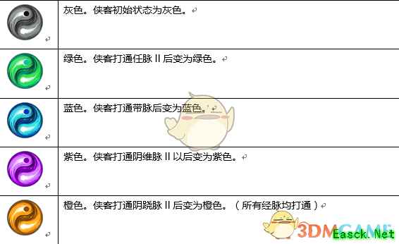 随着侠客穴位的激活,侠客的品质颜色(头像框)会逐渐进行改变,表示侠客进行了一个阶段的提升。经脉界面的八卦颜色将反映这个变化。