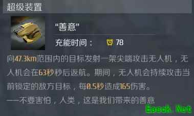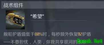 “希望” 舰船护盾值低于80%时,每秒额外恢复12护盾 ——不要担忧,人类,你我共享银河的未来。 超级装置