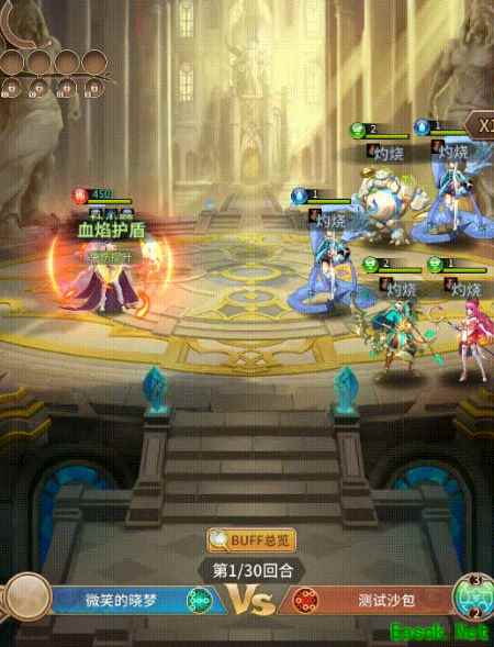 为自己附加【血焰护盾】和1层【劫火髓】,同时为己方全体火系单位提升免伤,随后对敌方全体一定概率附加【灼烧】; 第1回合释放,冷却2回合。 【血焰护盾】可吸收施法者攻击力一定比例的伤害,携带单位受到攻击时有概率对攻击方附加【灼烧】。 【劫火髓】携带者提升攻击和防御,可影响【焚天断罪】的效果;最多叠加数层。 被动·逆命狐誓 涂山小九的攻击提升,生命提升,免伤提升; 自身持有【劫火髓】时,可触发以下效果: 己方每对敌方附加1层【灼烧】类效果,自身有概率额外获得1层【劫火髓】,每个单位的出手轮次最多触发1次,叠满数层时不再触发; 回合开始时,提升自身一定暴击率和法伤。 主动·焚天断罪