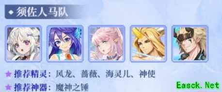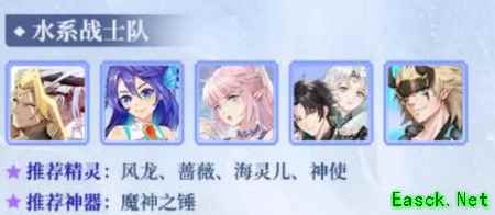 二、水系战士队 成员:盘古、娜迦、塞壬、麒麟、须佐之男。 推荐精灵:风龙、蔷薇、海灵儿、神使。 推荐神器:魔神之锤。