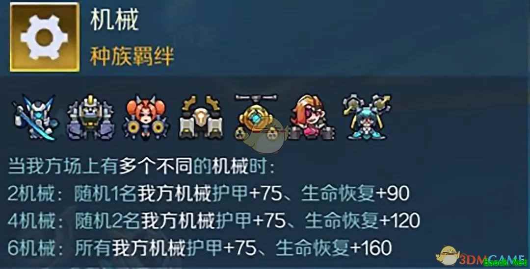 《战歌竞技场》机械羁绊攻略机械种族在游戏中有着强化护甲和恢复生命的能力,强力的机械种族也是棋盘上的霸主之一。 一、羁绊效果 机械家族很庞大,它们分别是赛博忍者、铁甲钢拳、爆裂音波、装甲克星、追猎者S90、邪能博士以及最终兵器-乔伊。