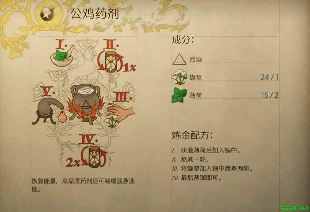天国拯救2中玩家们在战斗中会消耗大量的能量,而能量值过低的情况下,对玩家的战斗能力和移动会造成很大的影响,那么怎么在战斗中临时回复能量呢?今天小编为大家带来最实用的方法,饮用公鸡药剂,下面是它的配方。 成分: 烈酒、1个缬草、2个薄荷。 配方: 1、首先研磨薄荷,将其加入锅中。 2、熬煮一轮。 3、将缬草加入锅中,随后熬煮两轮。 4、最后进行蒸馏即可制作。