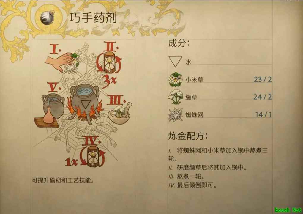 在天国拯救2中炼金是非常重要的玩法,玩家们在游玩中可以采集草药并在炼金台根据配方进行药剂的炼制,药剂不同的效果可以为玩家在不同的场景提供帮助。很多玩家想知道提高工艺技能的巧手药剂的配方,下面为大家带来介绍。 成分: 水、2个小米草、2个缬草、1个蜘蛛网。 配方: 1、加入蜘蛛网和小米草,熬煮3轮。 2、研磨缬草,加入锅中再熬煮一轮。 3、最后进行倾倒,完成制作。