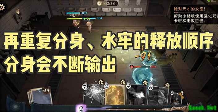 《哈利波特:魔法觉醒》小赫敏魔咒试炼第1关通关攻略:一、通关攻略 1、过完剧情进入战斗,开局先走到角落里释放时间转换器召唤分身,分身会不断使用我们卡组中的魔咒进行攻击。