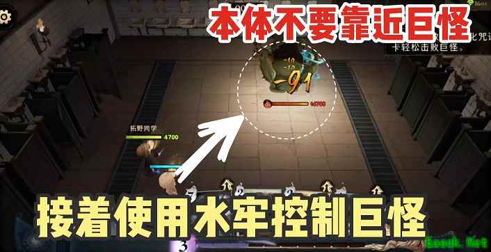2、使用水牢将巨怪控制住,这关的魔咒是强化版本的,水牢能多次将巨怪卷走并在场景中回弹。注意:巨怪接近我们自身或分身时仍然可以将我们抓起,因此本体要远离巨怪。