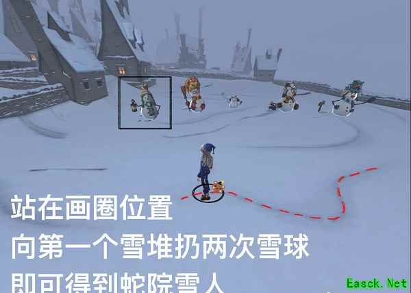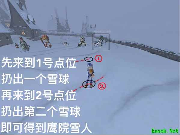 5、来到1号点位扔出一个雪球,再来到2号点位扔出第二个雪球,即可得到鹰院雪人。