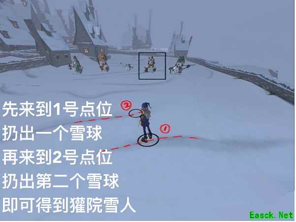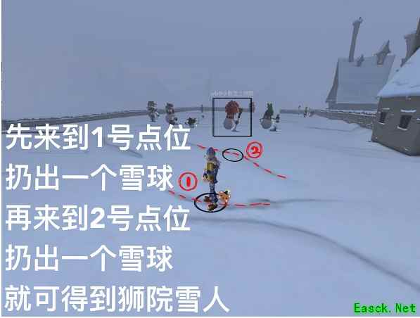 2、来到1号点位扔出一个雪球,再来到2号点位扔出一个雪球,即可得到狮院雪人。点位位置如图所示。