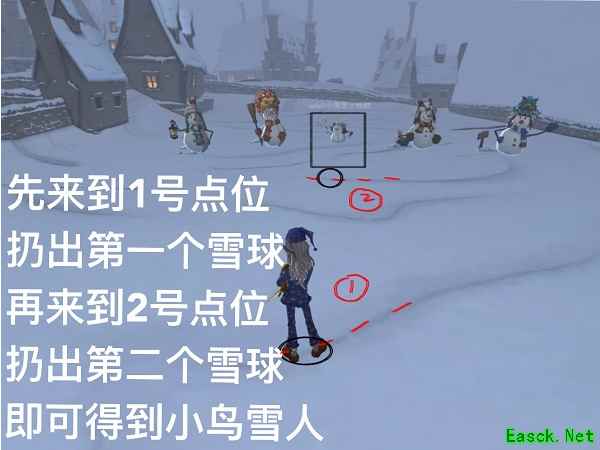 3、来到1号点位扔出第一个雪球,再来到2号点位扔出第二个雪球,即可得到小鸟雪人。点位位置如图所示。