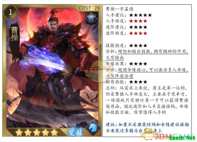 【武将】曹操势力进阶攻略—最适合入手的五星 前段时间小墨给各位主公分析推荐了各个势力所由的初始武将。今天小编带来了一个进阶的版本——五星武将。相信各位主公都希望拥有属于自己的五星部队(满队的五星强将想想也会很激动的)。首先我们来欣赏一下当前版本中,主公们可以获得曹操势力五星武将由哪一些。