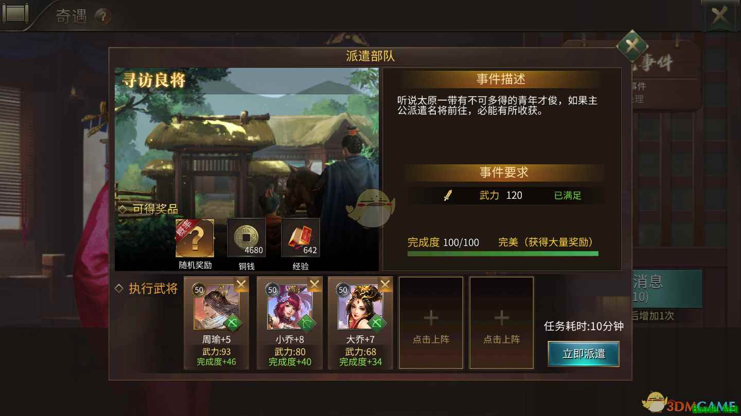 大部分完成任务的方式是派遣武将,满足事件的要求,按照完成度给与奖励。还有机会获得随机奖励,比如武将、好感物品等。