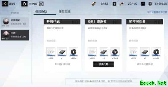 三、任务协助 在任务协助系统中,每位学员每日都可领取两个随机任务,若任务难度较大,教官还可以更换最多两次。学员完成任务后,双方都将获得875点指挥官经验、1技能点和1000个螺母,教官还能赠送给学员一个五星意识。