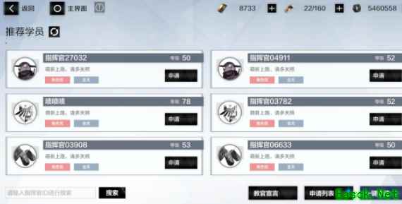 二、招募学员 如果玩家等级高过80级,那么就会自动成为首批教官,点击下方的学员招募即可查看待选学员列表。递交建立师徒关系的申请并通过后,双方即可开始协作,小编推荐在教官宣言中更改自己在线时间等重要信息,防止招徒失败哦。