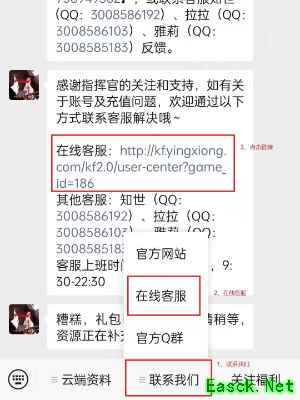 二、联系客服 第一步:微信上关注官方微信公众号【战双帕弥什】,按下图标示的操作进入在线客服页面;