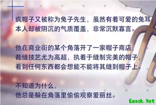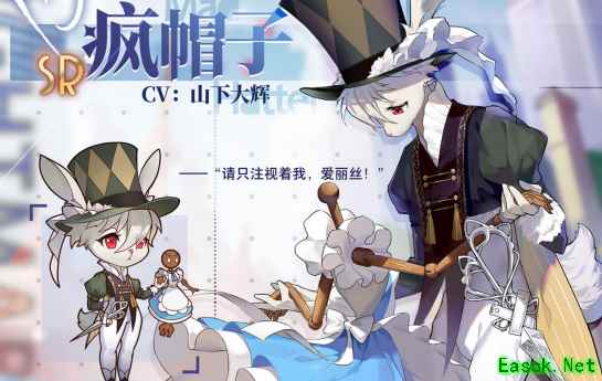 获取方式:游戏内通过复活节活动可获取该角色。 “请只注视着我,爱丽丝。”疯帽子又被成为兔子先生,与可爱的兔儿不符的是,疯帽子本人似乎非常的沉默寡言,被阴沉的气质所覆盖。他在商业街的某个角落开了一家帽子商店,裁缝技艺尤为高超,执着于缝制完美的帽子,看到任何东西都会想能不能将其缝到帽子上。不知道为什么,他总是躲在角落偷偷观察爱丽丝。