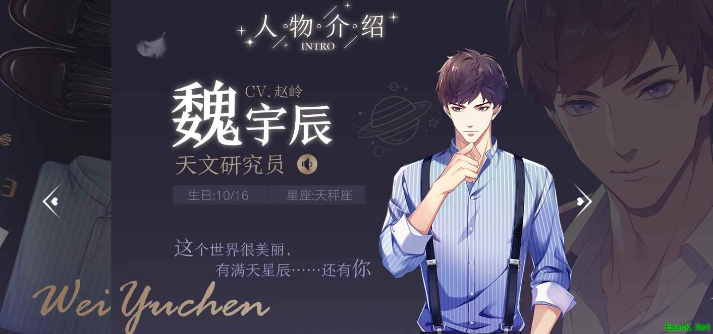 魏宇辰CV介绍若白昼之星光,沉寂低调,若夜晚之银河,深邃浩渺,他叫魏宇辰,一个与星辰为伴的男子。 CV:赵岭 职业:天文研究员 生日:10月16日 星座:天秤座