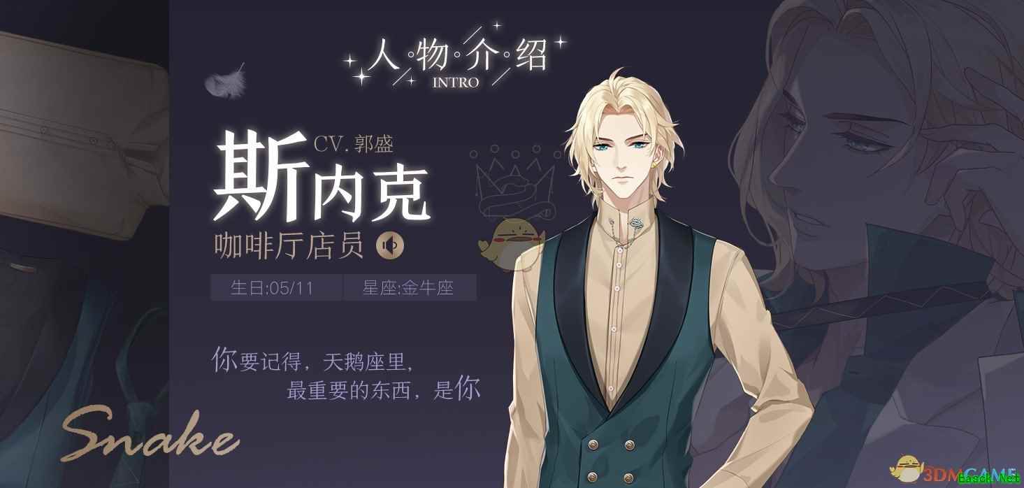 斯内克CV介绍梦间集天鹅座中斯内克是一位来自外国的男子,金发碧眼显得很有贵族气质。 CV:郭盛 职业:咖啡厅店员 生日:5月11日 星座:金牛座