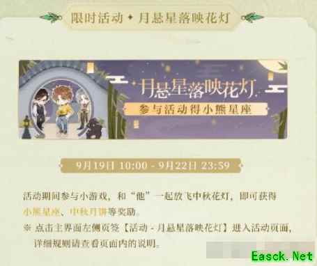 《光与夜之恋》月悬星落映花灯活动攻略限时活动 月悬星落映花灯 开放时间:9月19日 10:00 - 9月22日 23:59 活动说明: 活动期间参与小游戏,和“他”一起放飞中秋花灯,即可获得小熊星座、中秋月饼等奖励。 ※ 点击主界面左侧【活动 - 月悬星落映花灯】进入活动页面,详细规则请查看页面内的说明。