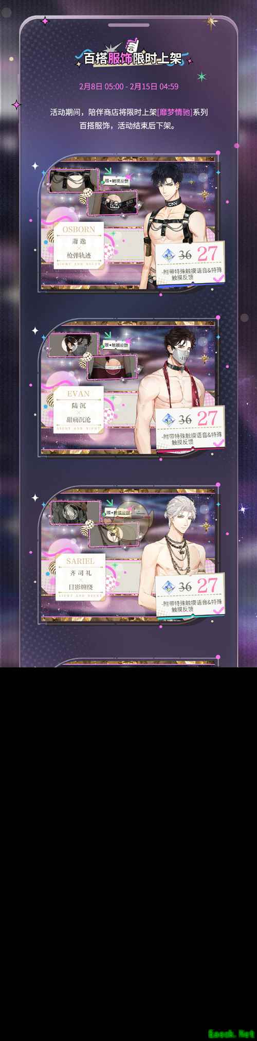 光与夜之恋靡梦情驰系列服饰什么时候上架?上线时间:2月8日05:00-2月15日04:59 活动期间,陪伴商店将限时上架[靡梦情驰]系列百搭服饰,活动结束后下架。 服饰价格:原价36北极星、优惠后27北极星 服饰特点:每位男主的服饰附赠特殊触摸反馈