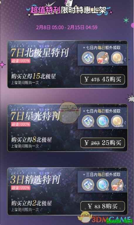 光与夜之恋2025年2月8日超值特刊礼包怎么样?超值特刊限时特惠上架: 活动期间,商城将限时上架超值特刊,活动结束后下架。 超值特刊礼包上架时间: 2月8日 05:00 - 2月15日 04:59 超值特刊限时礼包内容: 7日北极星特刊45¥:购买立得15北极星 7日星光特刊25¥:购买立得8北极星 3日精选特刊8¥:购买立得2北极星