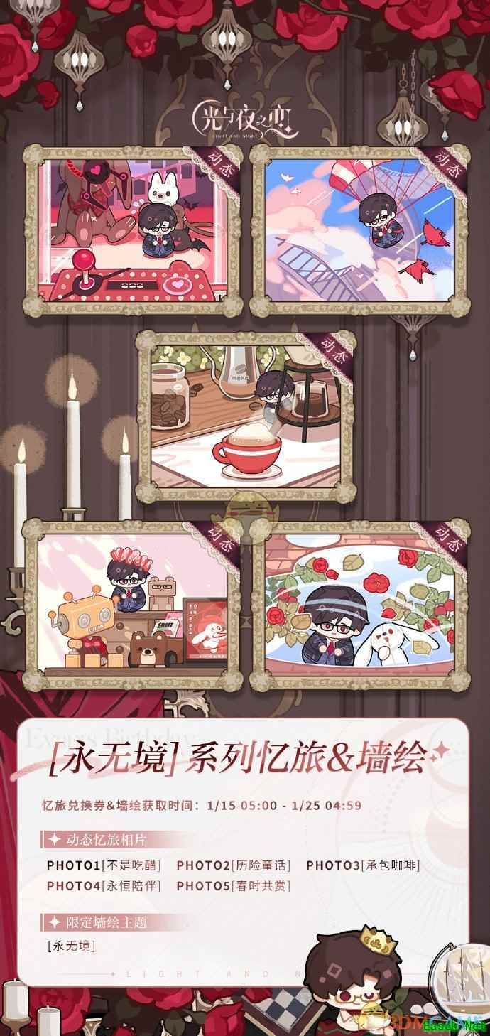 永无境是游戏中陆沉生日活动新增的全新系列相片,这个系列的相片有5款,每一款都对应了男主的生日QQ人的互动,这个系列相片的获取方法也是大家非常关注的,那么这个系列的相片怎么获得呢?下面就让小编给大家带来《光与夜之恋》陆沉永无境系列忆旅相片获得方法,一起往下看看吧。